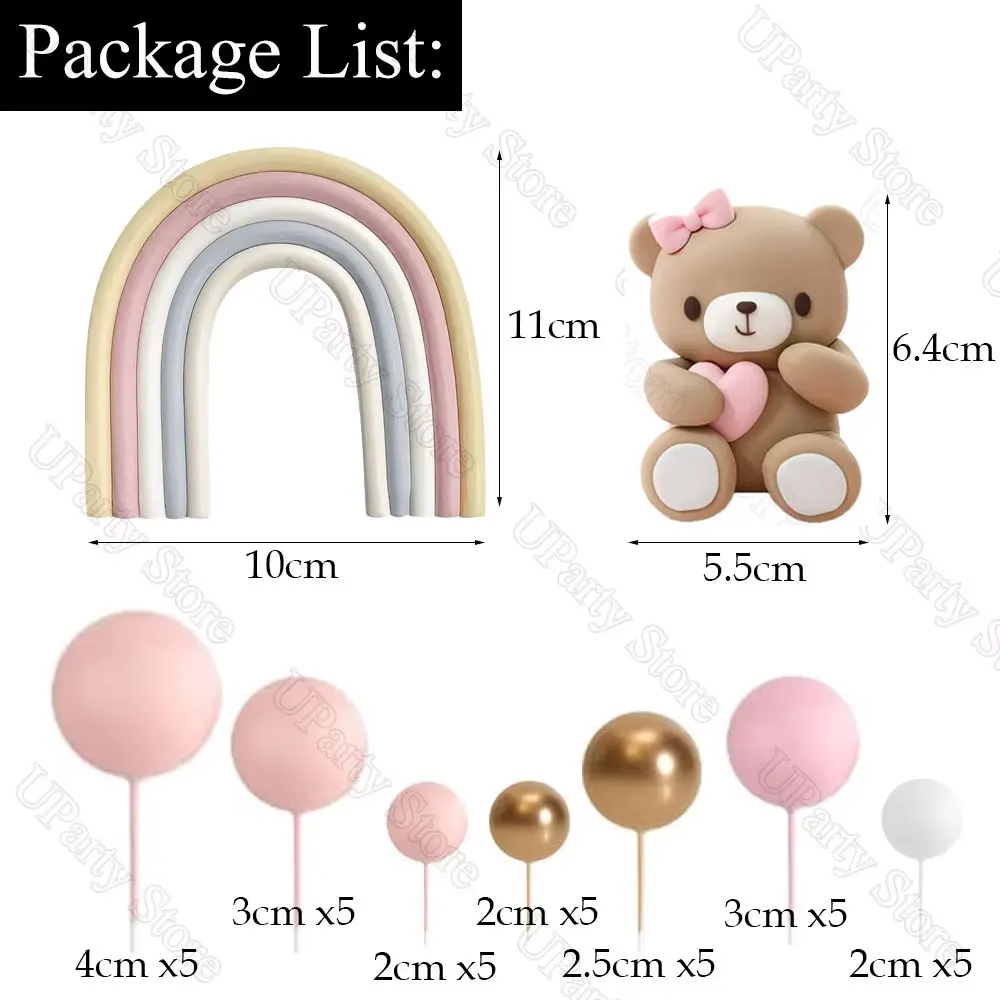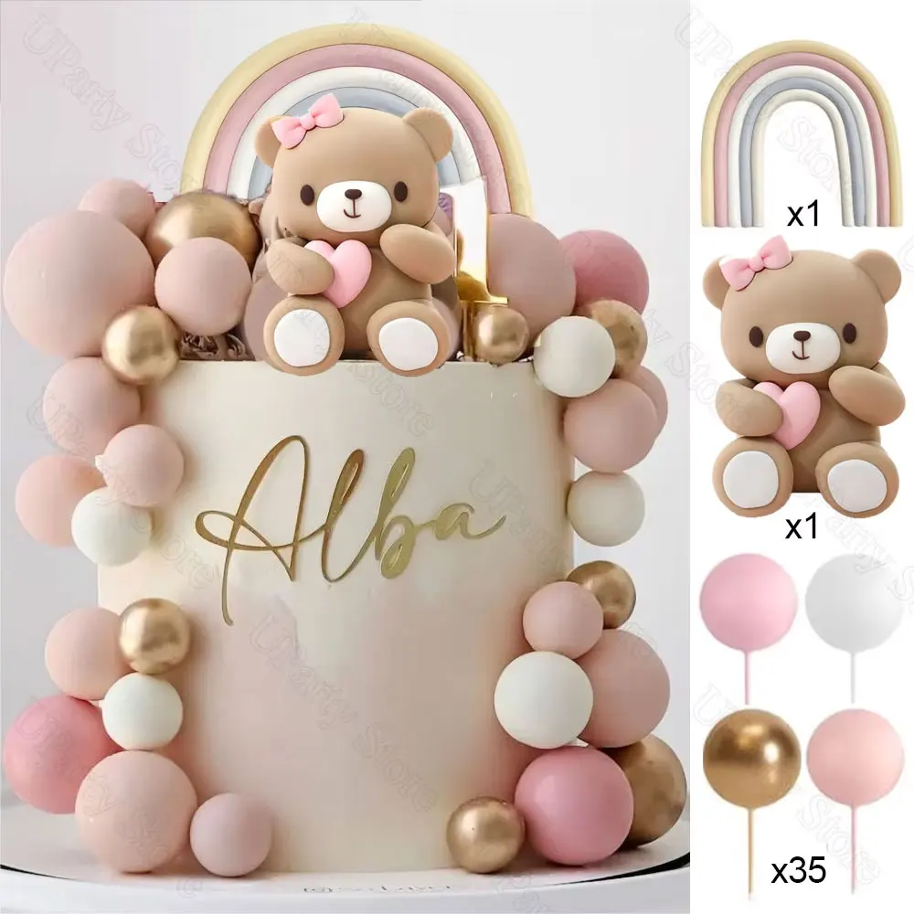 1 Set Pink Bear Cake Toppers Boho Rainbow Nude Baby Pink Balls Cake Decorations for Birthday Baptism Baby Shower Party Favor