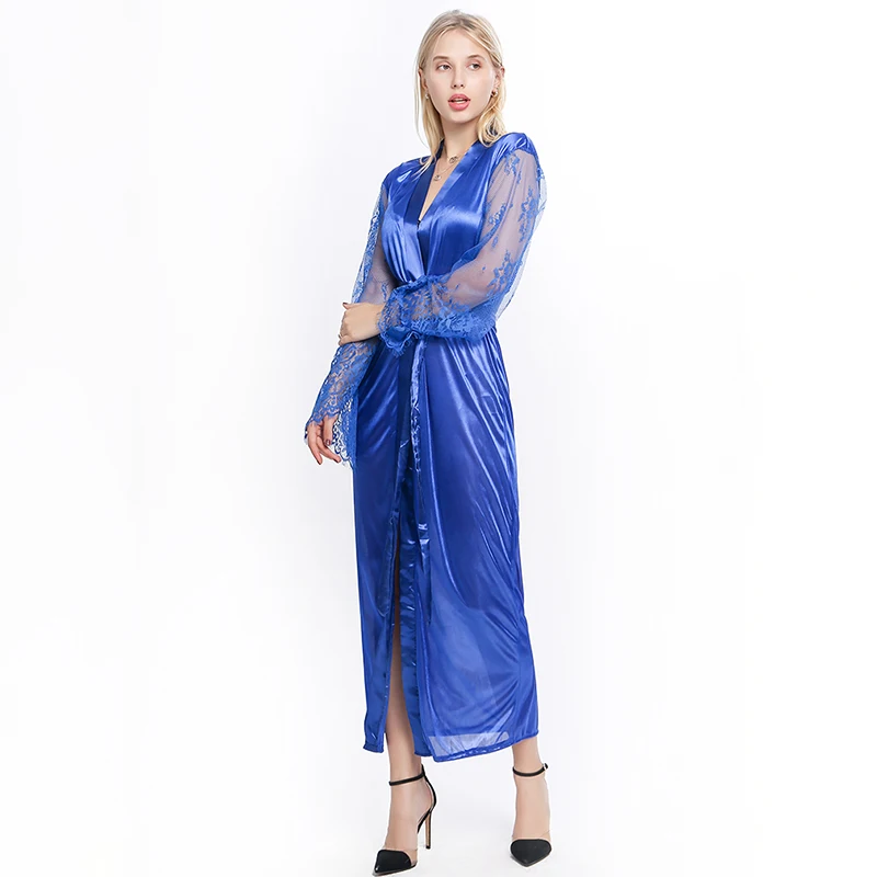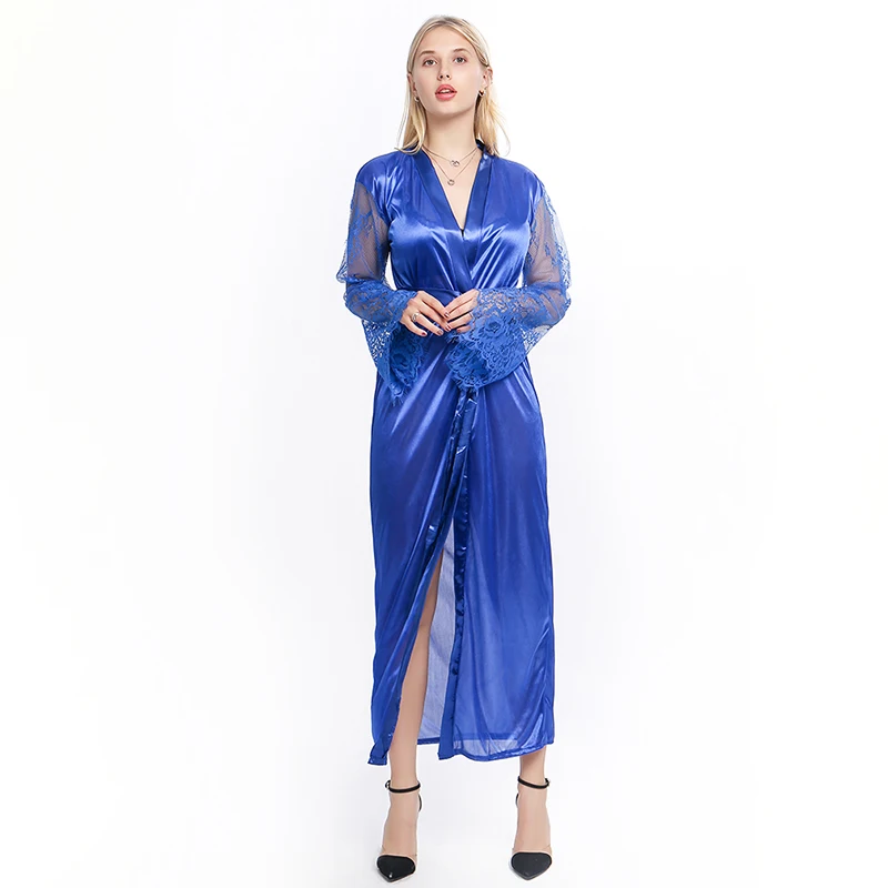Womens Nightdress Sexy Long Lace Lingerie Nightwear Bath Robe Gown Imitation Ice Silk Nightdress Solid Color Nightgown